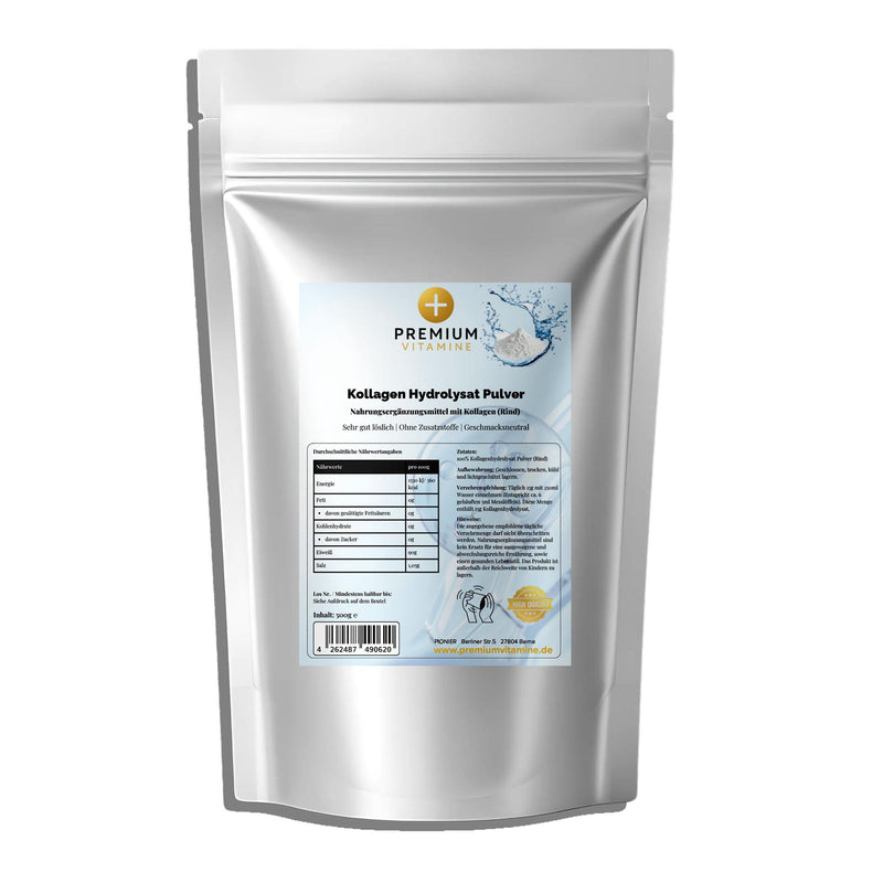 Kollagen Hydrolysat Pulver in praktischer 500g Doypack-Verpackung mit zusätzlichen Mineralstoffen. Dieses hochwertige Kollagenhydrolysat wird durch enzymatische Spaltung gewonnen und bietet eine optimale Bioverfügbarkeit. Die Peptide unterstützen die natürliche Kollagensynthese und fördern die Elastizität von Haut, Haaren und Gelenken. Angereichert mit essentiellen Mineralstoffen für eine umfassende Nährstoffversorgung. Geschmacksneutral und leicht löslich – ideal für die tägliche Supplementierung in Getränken oder Speisen.