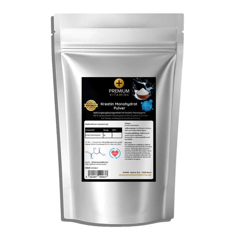 Kreatin Monohydrat ist eine bewährte Ergänzung für Sportler und Fitness-Enthusiasten. Unser hochreines Pulver unterstützt die Muskelkraftentwicklung und trägt zur Verbesserung der Trainingsleistung bei. Mit 1000g pro Packung erhalten Sie eine langfristige Versorgung. Das Monohydrat-Format bietet optimale Bioverfügbarkeit und ist einfach zu dosieren. Ideal für intensives Kraft- und Ausdauertraining. Täglich 5g mit ausreichend Wasser einnehmen.