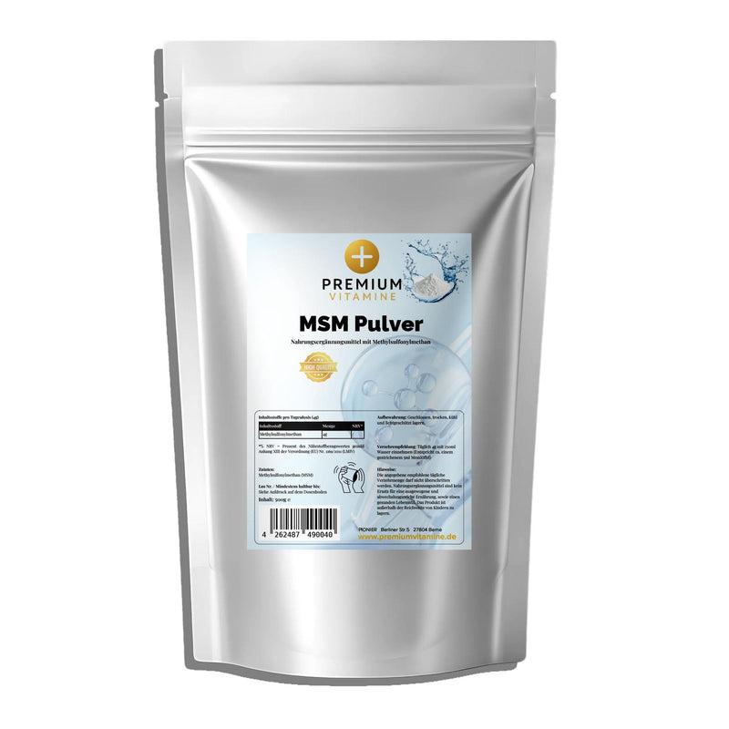 MSM (Methylsulfonylmethan) ist eine natürlich vorkommende Schwefelverbindung, die in vielen Lebensmitteln enthalten ist. Unser hochreines MSM Pulver unterstützt die Gesundheit von Gelenken, Knorpel, Haut und Bindegewebe durch die Bereitstellung von bioverfügbarem Schwefel. Das feinkörnige Pulver lässt sich leicht in Getränke oder Speisen einrühren und ermöglicht eine flexible Dosierung. Mit 500g Inhalt bietet dieses Produkt ein ausgezeichnetes Preis-Leistungs-Verhältnis für eine langfristige Supplementierung. Ideal für alle, die ihre Gelenkfunktion und Hautgesundheit auf natürliche Weise fördern möchten.